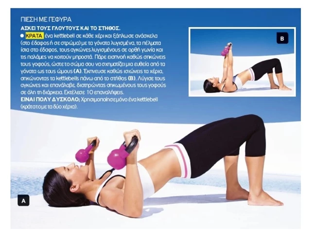 Κράτα ένα kettlebell σε κάθε χέρι και ξάπλωσε ανάσκελα (στο έδαφος ή σε στρώμα) με τα γόνατα λυγισμένα, τα πέλματα ίσια στο έδαφος, τους αγκώνες λυγισμένους σε ορθή γωνία και τις παλάμες να κοιτούν μπροστά. Πάρε εισπνοή καθώς σηκώνεις τους γοφούς, ώστε το σώμα σου να σχηματίζει μια ευθεία από τα γόνατα ως τους ώμους (Α). Έκπνευσε καθώς ισιώνεις τα χέρια, σηκώνοντας τα kettlebells πάνω από το στήθος (Β). Λύγισε τους αγκώνες και επανάλαβε, διατηρώντας σηκωμένους τους γοφούς σε όλη τη διάρκεια. Εκτέλεσε 10 επαναλήψεις. Είναι πολύ δύσκολο; Χρησιμοποίησε μόνο ένα kettlebell (κράτα το με τα δύο χέρια).